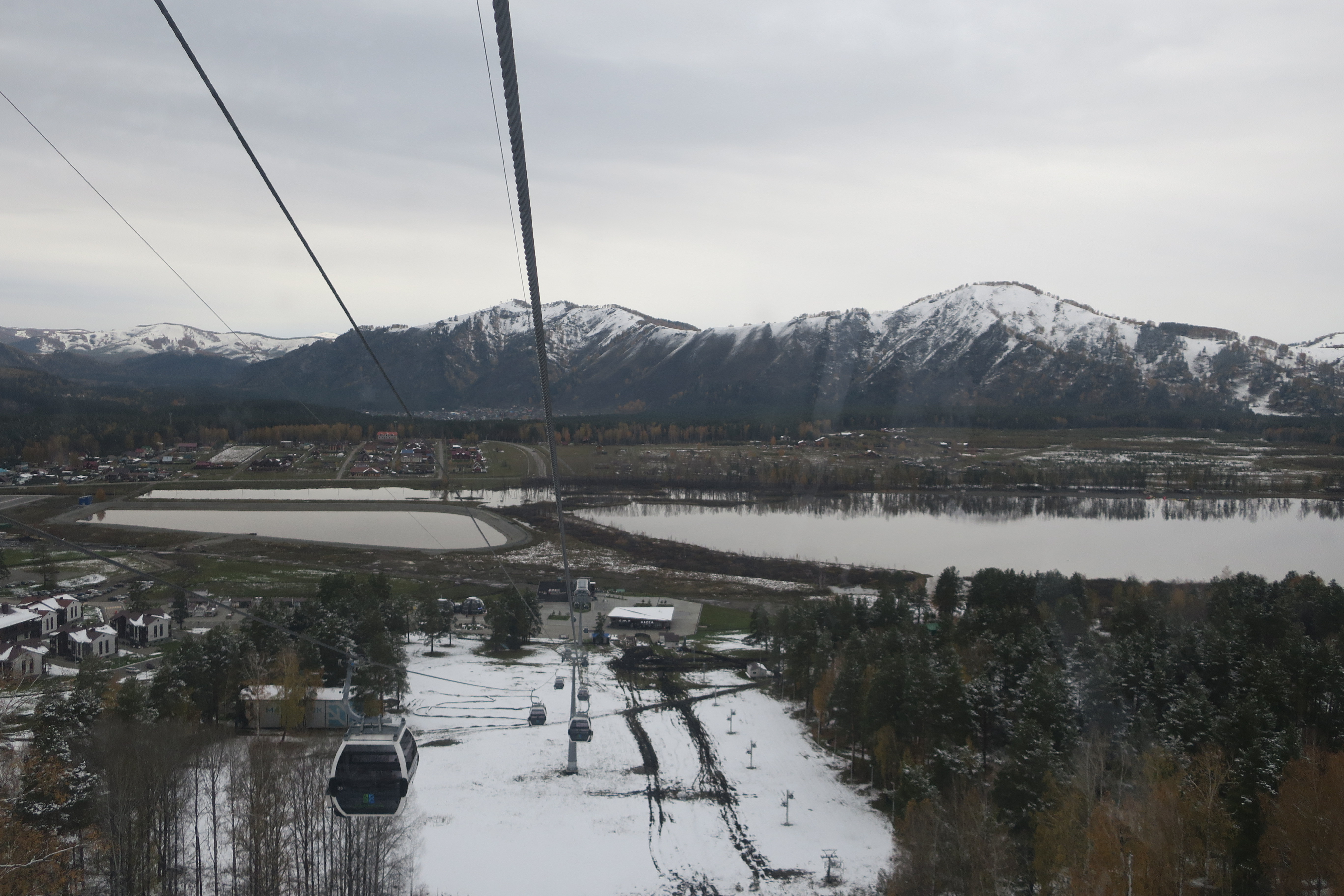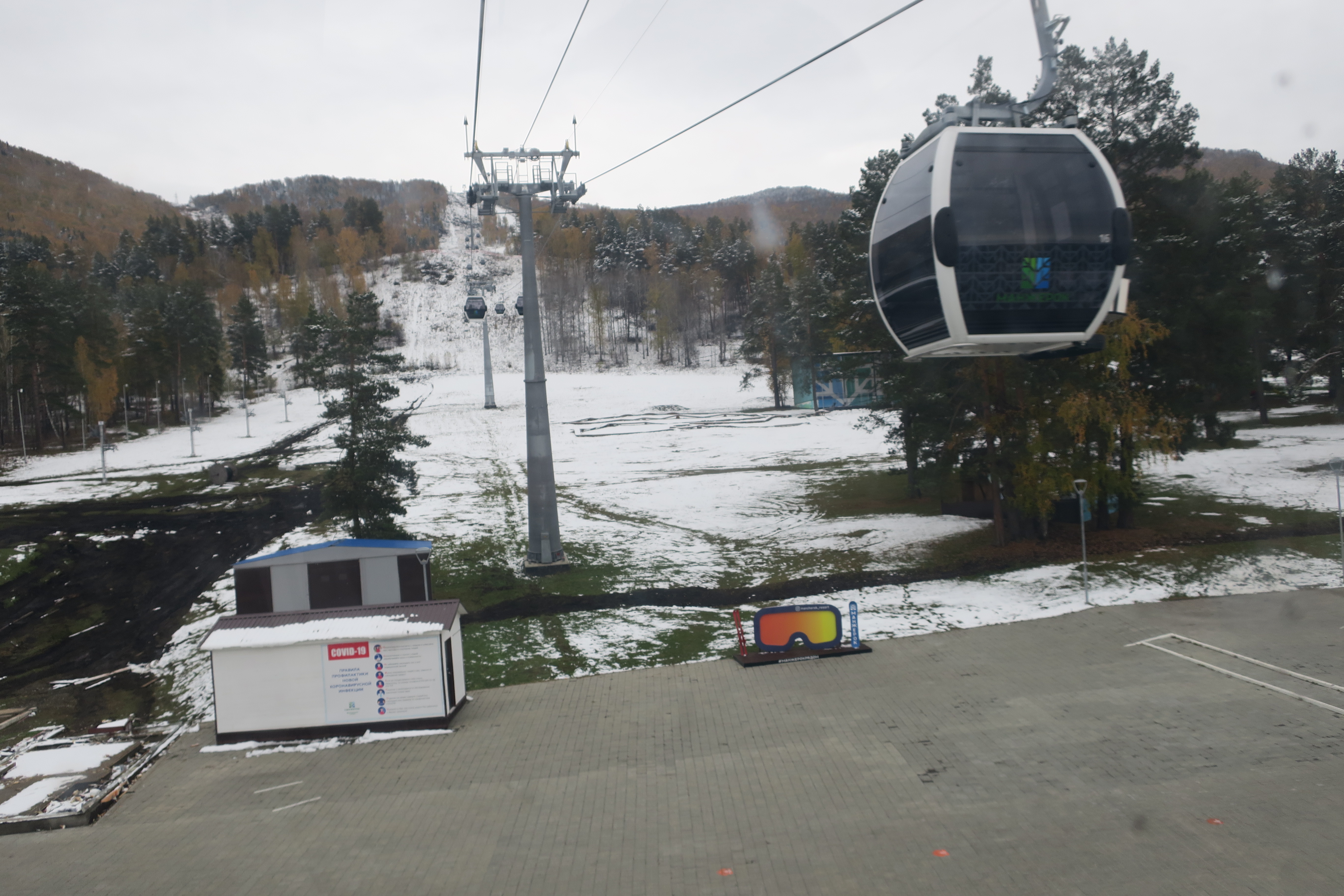 дорога. Канатка очень интересно подвешена, кабинки могут