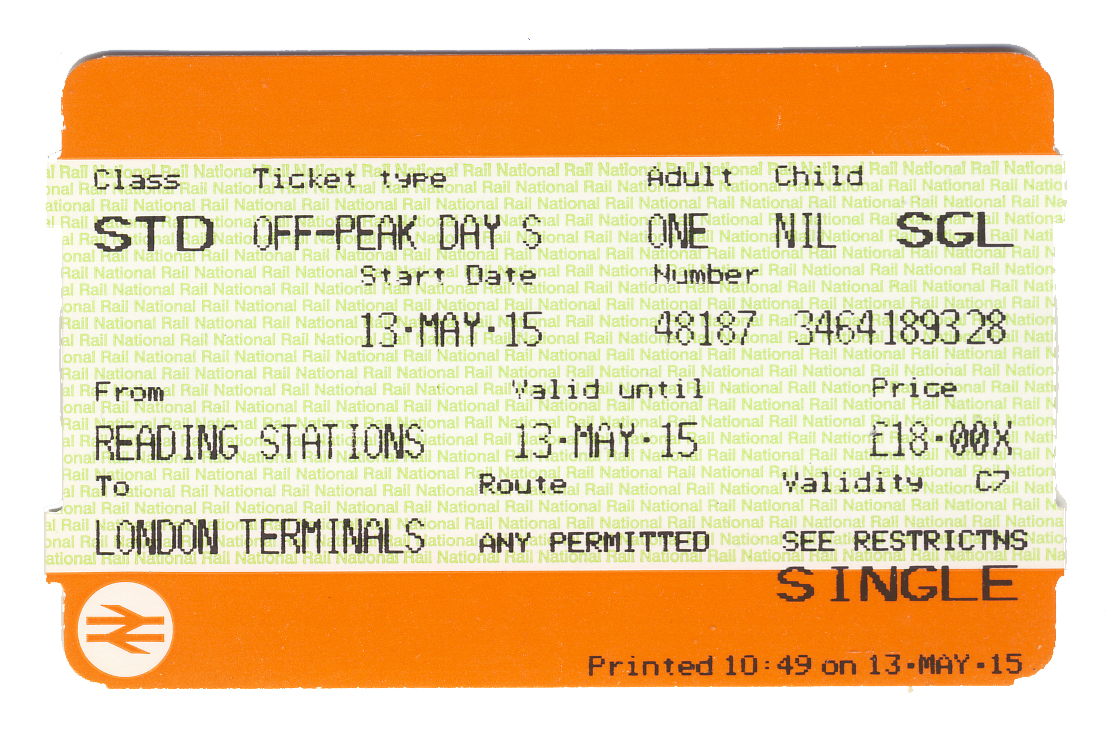 А вот так выглядят типичные оранжевые билетики (мне надо было сохранить один день годности абонемента для Финляндии, поэтому в день последнего переезда по Англии, когда нужен был только один поезд, пришлось взять билетик)